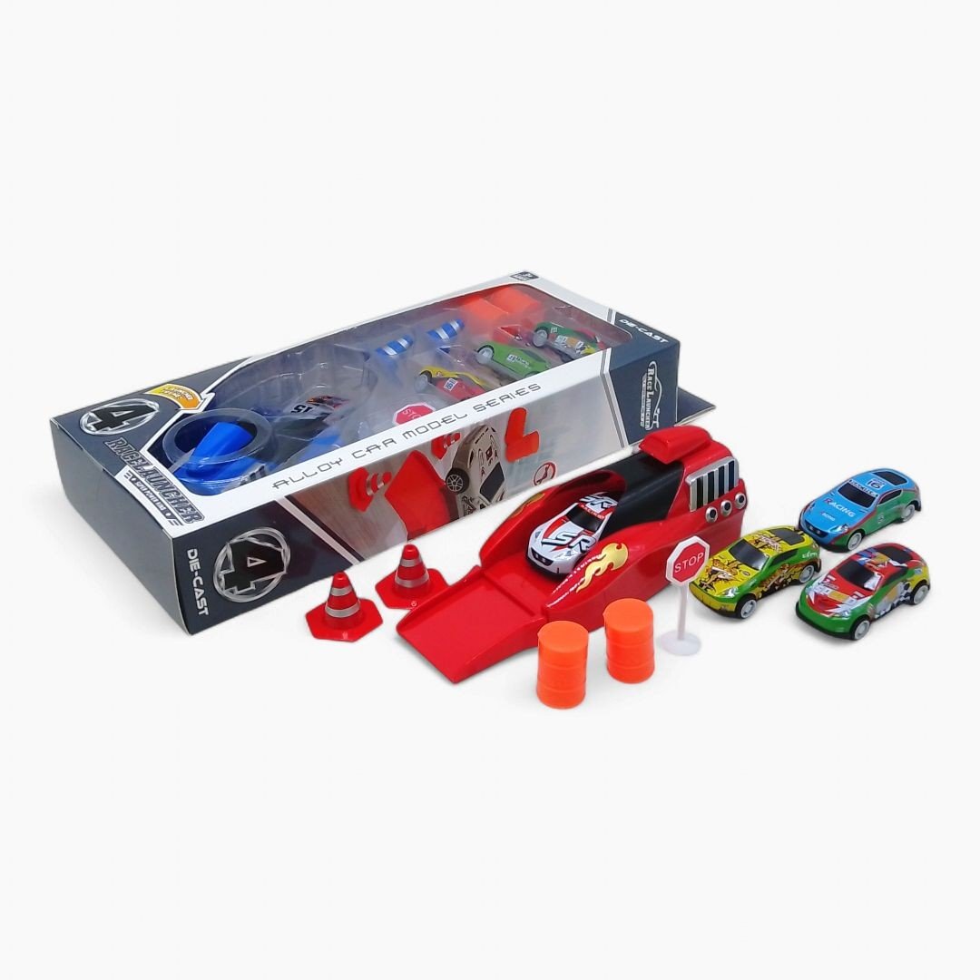 Бренд: MIC Упаковка: Коробка Колір: Різнобарв'я Вага з упаковкою: 190 г Габарити в упаковці: 13 x 33 x 5 см Країна виробник: Китай Матеріал: Комбінований Комплектація: 4 машинки, запуск, 2 конуси, знак, 2 бочки
