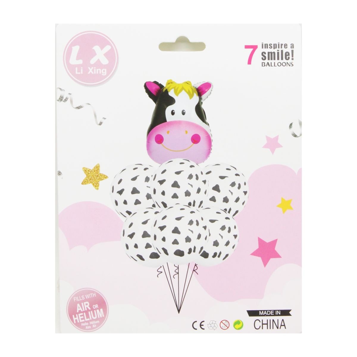 У набір кульок "Корова" входить одна велика фольгована куля у вигляді голови корови і 6 маленьких кульок з візерунком, що повторює плямки на тілі тварини. Розмір фольгованої кулі - 63х40 см. У наборі є моток стрічки для зав'язування куль.