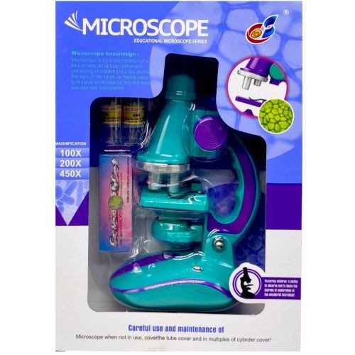 Набір складається з пластикового мікроскопа (19,5 х 11,5 см), 2-х баночок для елементів і рідин, 4-х предметних скелець і скельця зі зразком. Мікроскоп має безліч функцій: можна регулювати фокус, є функція підйому і спуску, також має 3 інтегральних лінзи. Максимальне збільшення: 450 х.