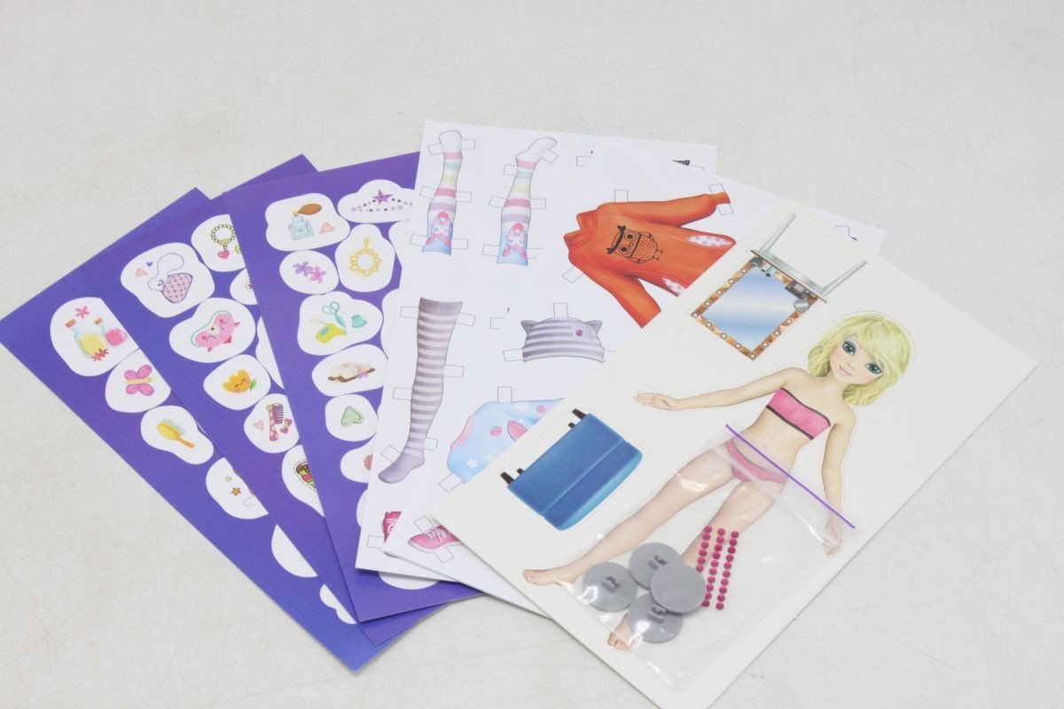 Набір-одягалка серії "Fashion look". У набір входить картонна фігурка ляльки, зручне кріплення-підставка, 15 елементів одягу та 7 пар взуття, 3 аркуші з яскравими наклейками та 30 самоклеючих стразів. Одяг легко кріпиться та знімається. Виконано з якісних та безпечних матеріалів, виготовлено в Україні.
