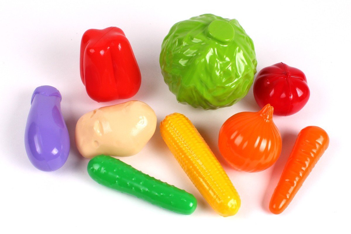 Яскравий набір пластикових овочів. У комплекті: капуста, огірок, морква, цибуля, помідор, перець, картопля, кукурудза і баклажан.