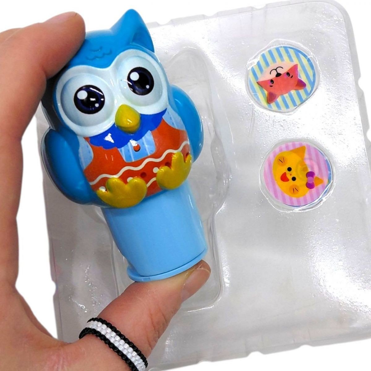 Яскравий набір дитячих печаток із фігуркою сови - цікава розвивальна іграшка для творчих занять вдома. Комплект допомагає дитині створювати власні малюнки, вивчати форми та зображення в ігровій формі.