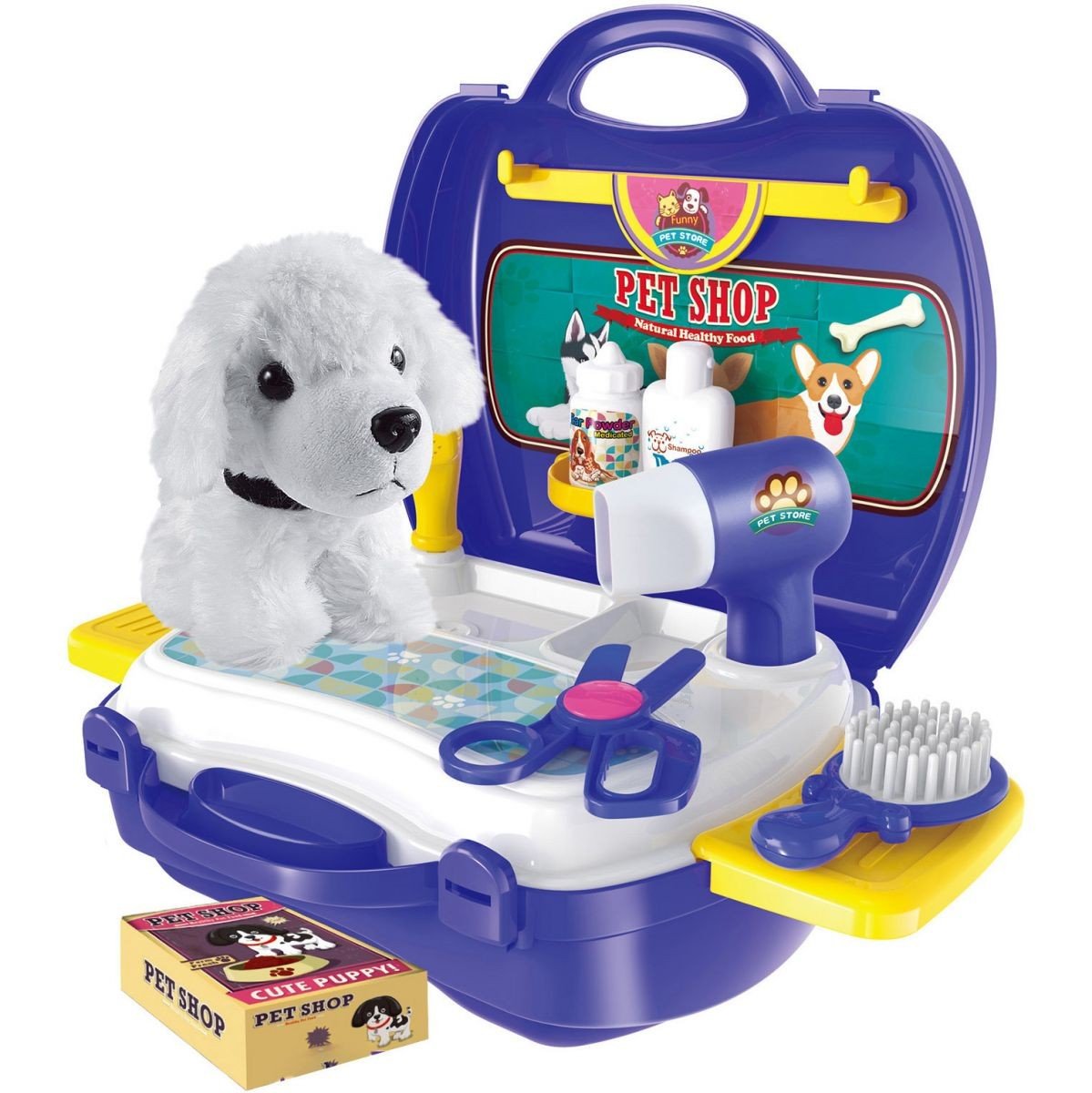Бренд: Bowa Упаковка: Валіза Колір: Різнобарв'я Вага з упаковкою: 477 г Габарити в упаковці: 22.5 x 10 x 22.5 см Габарити без упаковки: 23 x 10 x 23 см Країна виробник: Китай Матеріал: Пластик Комплектація: Валіза, столик з поличками, м'яка іграшка собачка, гребінець, ножиці, фен, душ, 2 баночки, коробочка, наклейки