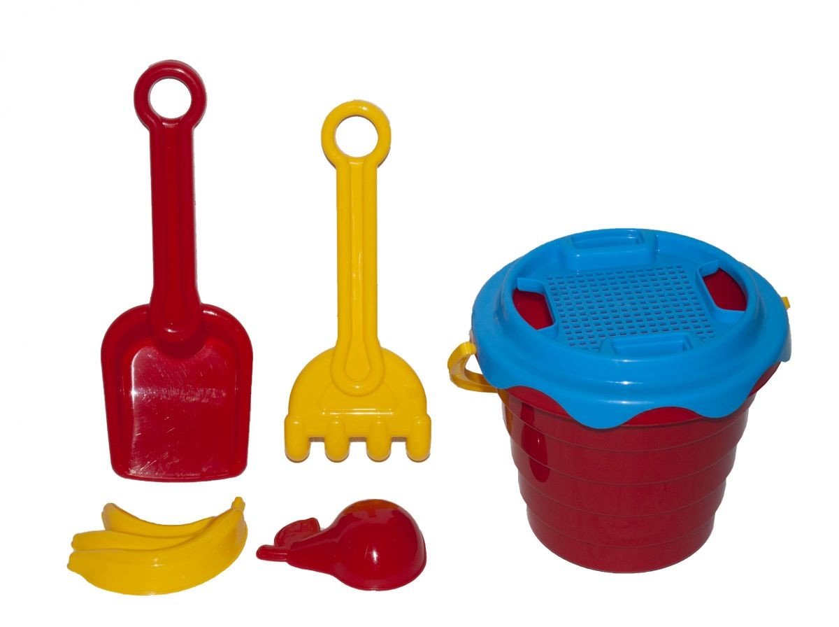 Опис Набір пісочний "А" (відерце, сито, лопатка, грабельки, 2 пасочки), червоний