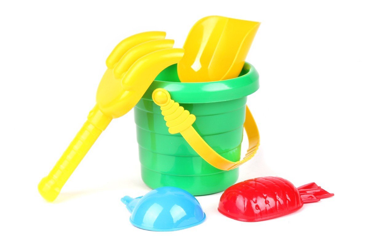 Набір для гри в піску, саду або будинку. Маленьке відерце, лопатка, грабельки і 2 формочки для піску у вигляді фруктів. Довжина лопатки і грабельки - 17 см. Розмір відра - 11 х 11 х 10 см.