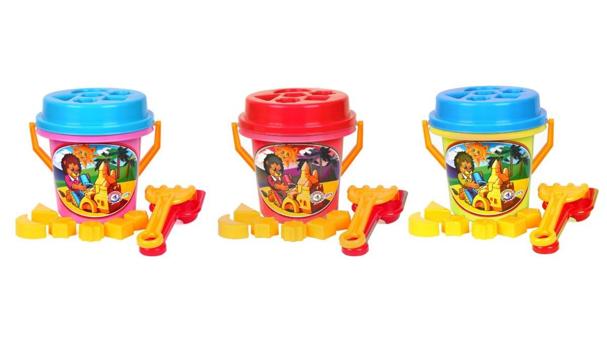 Набір для піску. Різні кольори. Відерце з кришкою-сортером, форми для сортера 6 шт., Лопатки і граблі (20 см)