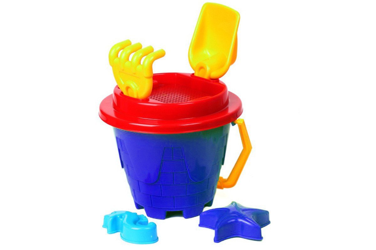 Яскраве пластикове відерце для гри в пісочниці. У наборі є дві пасочки, у вигляді тварин, грабельки, лопатка і ситечко.