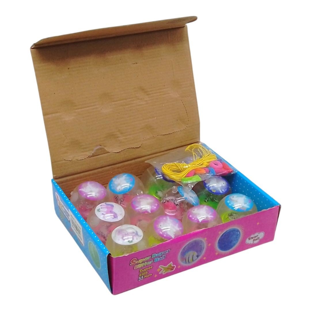 Набір з 12 яскравих стрибунців, наповнених водою, з мʼячиком, що світиться, який спалахує при ударі. Кожен стрибунець діаметром 5,5 см і має всередині різнокольоровий декор. Ідеально підходить для веселих ігор та розваг! Шнурки із резинками в комплекті.