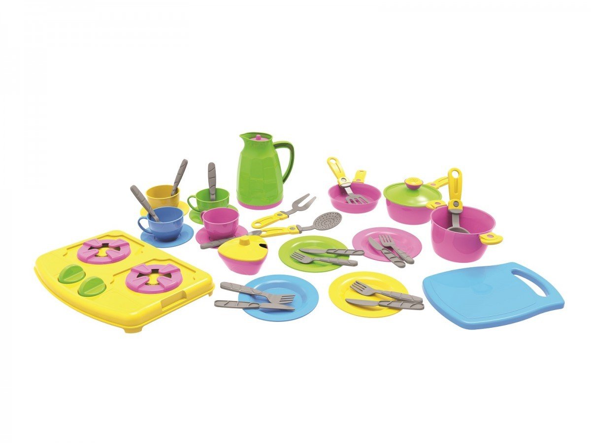 Пластиковий набір посудкі з 38 предметів. У комплекті: плита, графин з кришечкою, 3 блюдця, 4 чашечки, 4 чайні ложечки, цукорниця з кришечкою, 4 тарілки, 4 пари столових приладів (виделка і ніж), каструлька з кришечкою, каструлька з ручкою, дошка, 4 приладу для готування , сковорідка.
