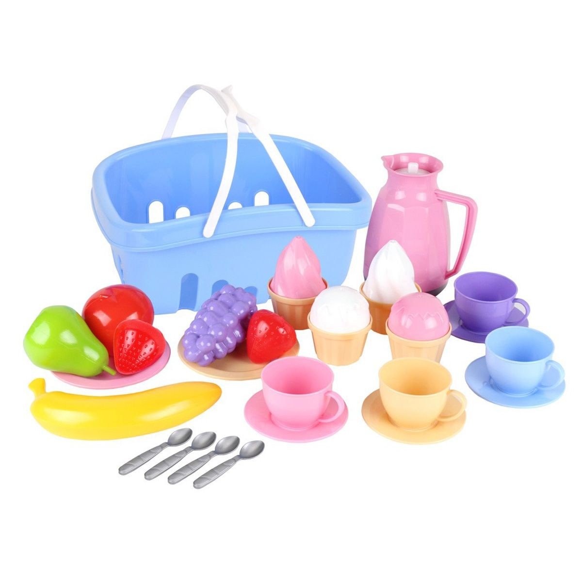 Ігровий набір посудкі буде хорошим подарунком дитині. У комплекті є: корзина, кавник з кришкою, 4 чашки з блюдечками і ложечками, 2 тарілки, 4 різні формочки у вигляді «кексів з вершками», виноград, яблуко, груша, банан, 2 полуниці. Виконаний з якісного пластику.