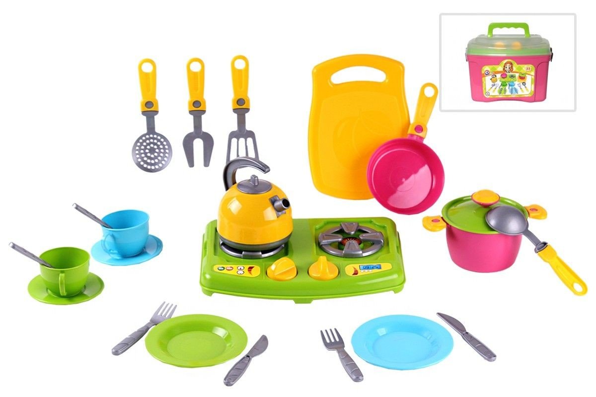 Пластиковий набір посуду з 23 предметів. У комплекті: плита з 2-ма конфорками (23,5 х 17,5 см), сковорідка, каструля з кришкою, дощечка (19 х 13,5 см), чайничок, 2 тарілки, 2 блюдця, 2 чашечки, 2 чайні ложечки , 2 вилки і 2 ножі, 4 приладу для готування. Для упаковки йде рожевий скриньку з ручкою, що дозволяє легко носити набір з собою.