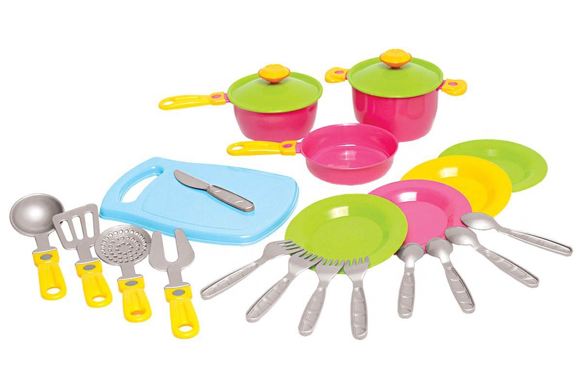 Пластиковий набір посуду з 23 предметів. У комплекті: сковорідка, каструлька з кришкою і ручкою, кастоюлька з кришкою, 4 приладу для готування, 4 тарілки, 4 вилки, 4 ложки, ніж і дощечка для різання (18,5 х 13 см).