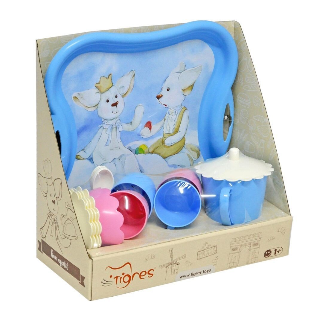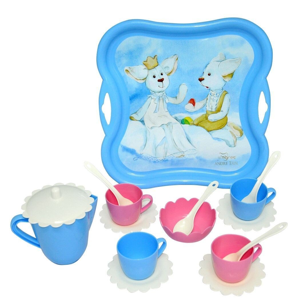 Бренд: TIGRES Упаковка: Шоубокс Колір: Блакитний Вага з упаковкою: 570 г Габарити в упаковці: 29.5 x 28.5 x 15 см Країна виробник: Україна Матеріал: Пластик Комплектація: Піднос, чайничок з кришечкою, 4 чашечки, 4 блюдця, цукорниця, чайні ложечки