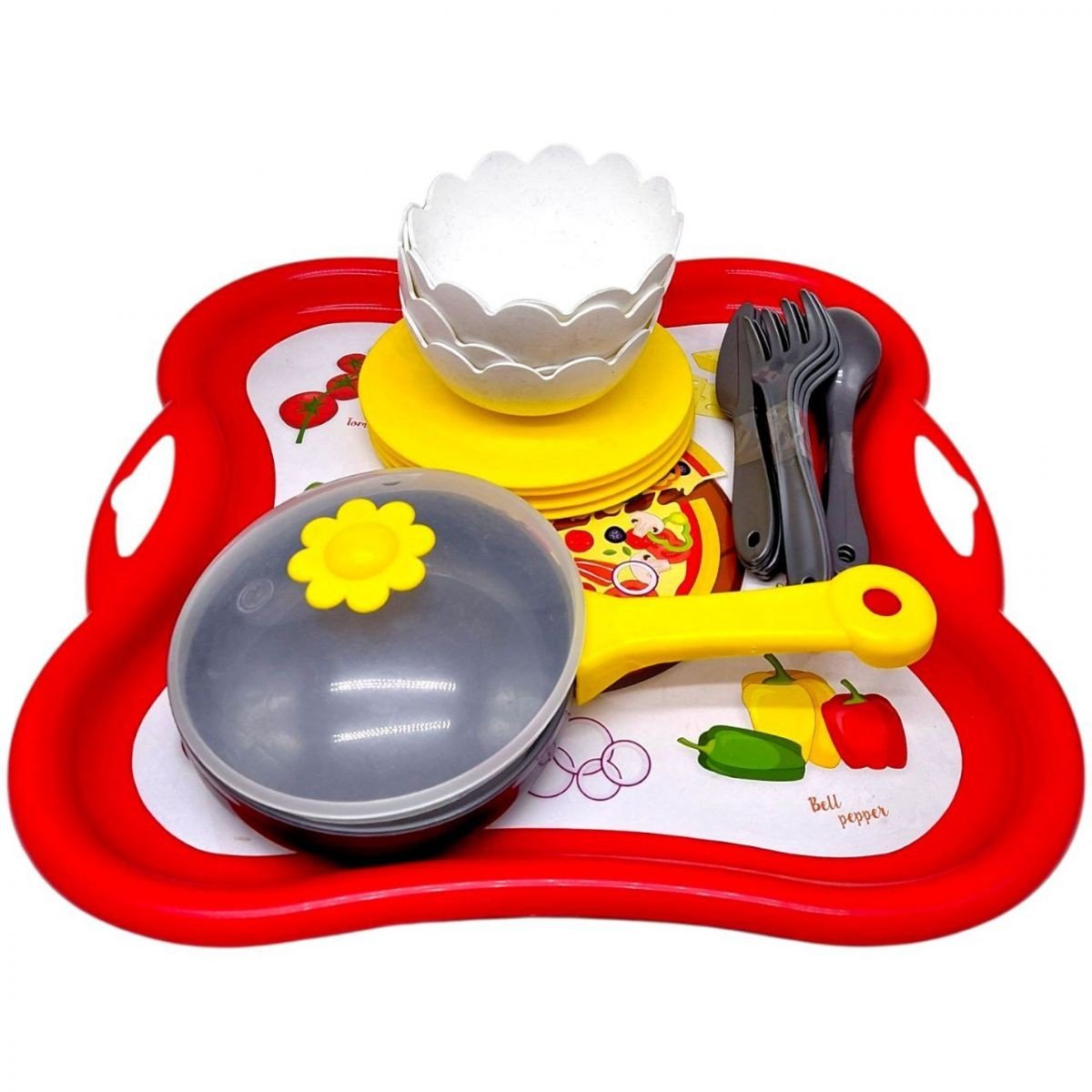 Набір пластикового дитячого посуду на підносі з яскравим, "апетитним" принтом. У комплекті: піднос (29 х 29 см), 4 мисочки (d=9 см), 4 тарілочки (d=12 см), 4 ложки, 4 вилки, 4 ножі, лопатка та сковорідка з кришечкою. Призначений для дітей віком від 12 місяців.