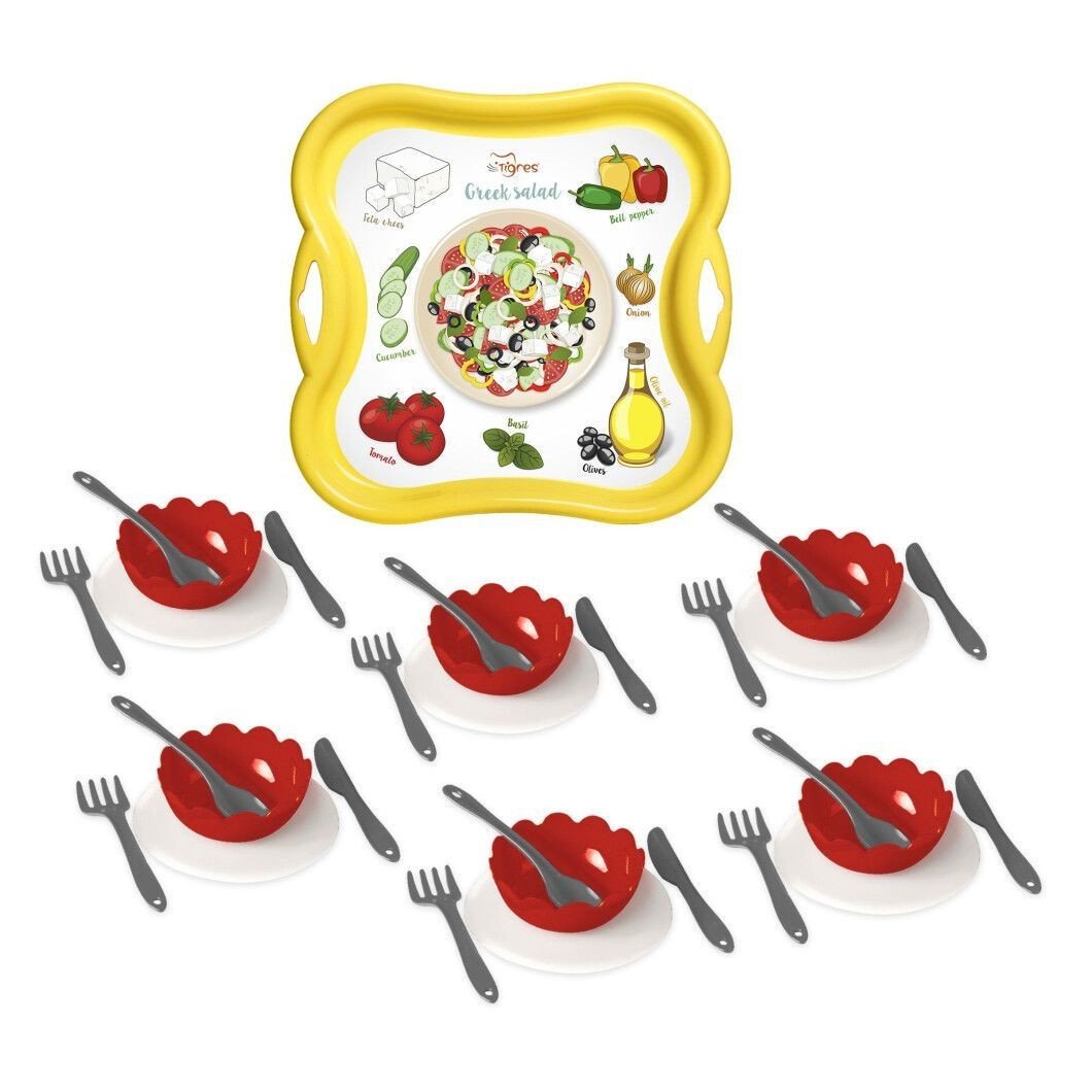 Бренд: TIGRES Упаковка: Сетка Колір: Різнобарв'я Вага з упаковкою: 390 г Габарити в упаковці: 8 x 29 x 29 см Країна виробник: Україна Матеріал: Пластик Комплектація: Таця, 6 мисочок, 6 тарілочок, 6 ложок, 6 виделок і 6 ножів