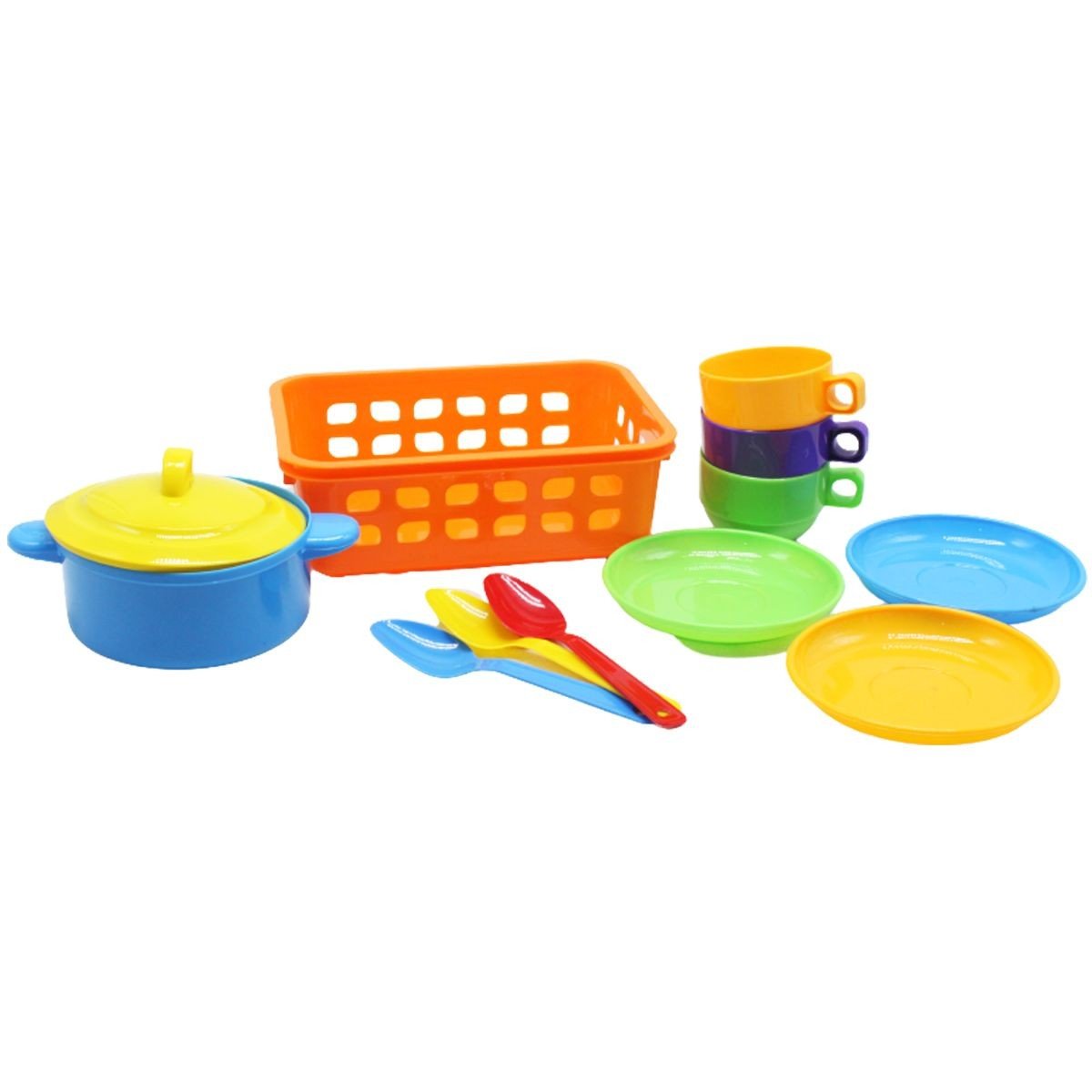 Пластиковий кошик з набором яскравого посуду: 3 тарілочки, 3 ложечки, 3 чашки та каструлька. З цим набором зможе влаштовувати чаювання, грати в магазин чи кухарі. Усі елементи виконані з якісних та міцних матеріалів. Розмір кошика: 14х19х7 см. Різні види в асортименті.