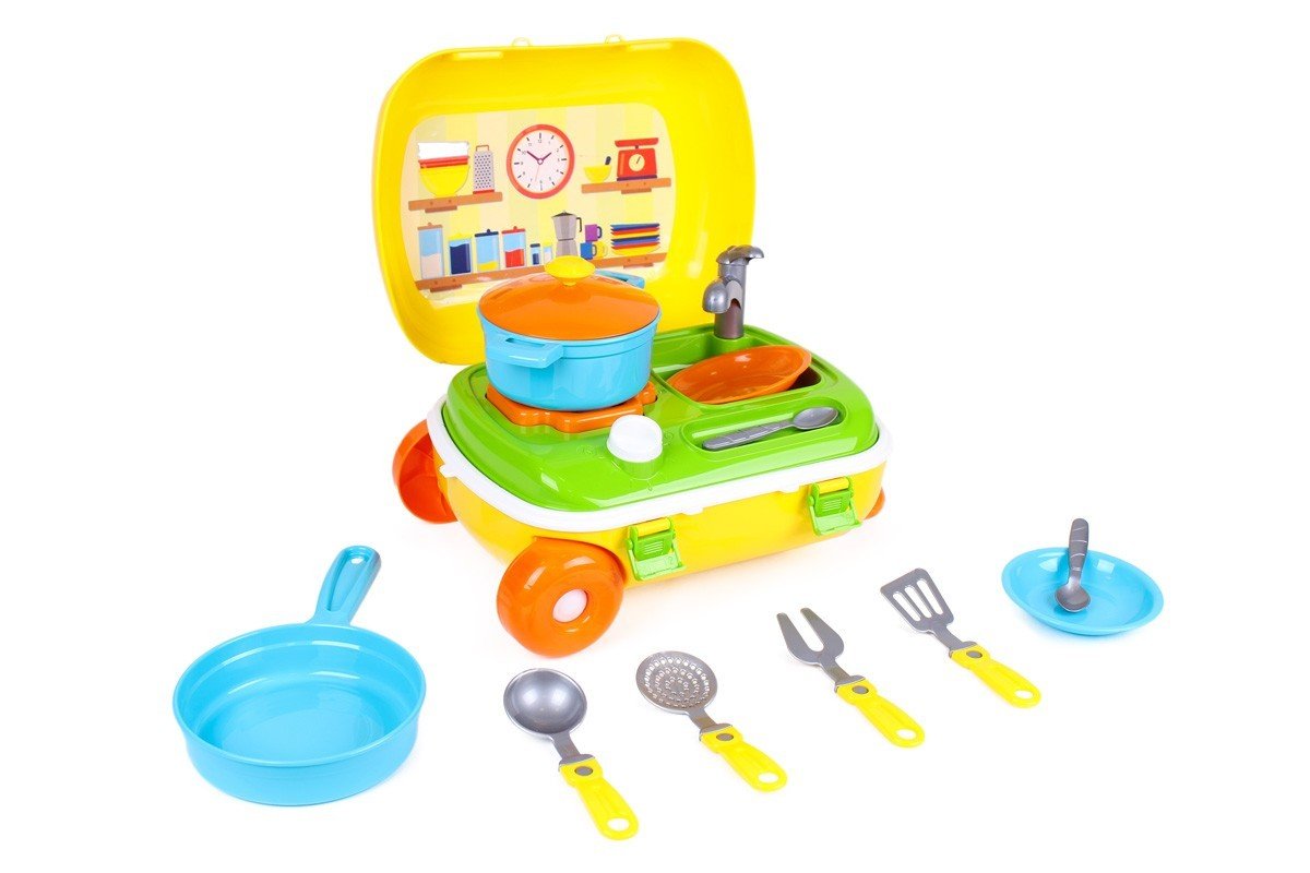 Набір складається з яскравого пластикового валізки на коліщатках, який має висувну ручку (висота від підлоги до висунутої ручкою: 50 см). Усередині валізки знаходиться набір посудкі: плита з конфоркою і умивальником, каструлька з кришечкою, сковорідка, 4 приладу для готування, 2 тарілки і 2 ложки.