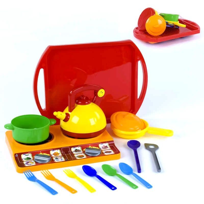 Набір яскравою пластикової посудкі. У комплекті: піднос (37 х 26 см), плита на 2 конфорки, чайник, каструлька з кришкою, сковорідка, 3 ложки, 3 вилки і 2 прилади для готування.