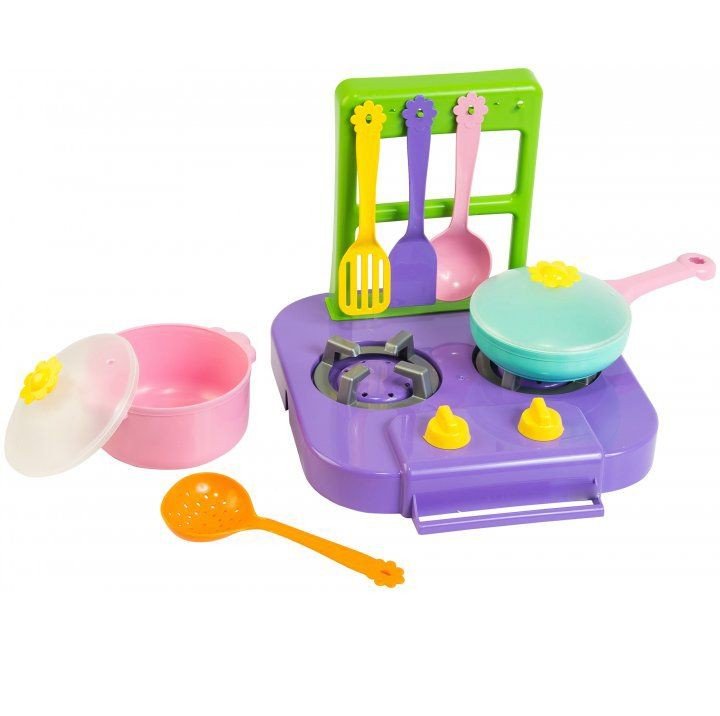 Набір яскравою пластикового посуду "Ромашка" складається з плити з 2-ма конфорками і підставкою для лопаток, каструльки з кришечкою, каструльки з ручкою і кришкою, і 4х приладів для готування.