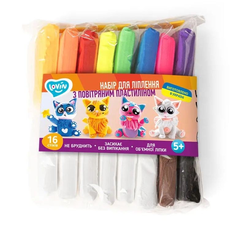 Набір повітряного пластиліну для дитячої творчості. Самозастигаючий пластилін дуже пластичний, мʼякий та легкий. Не прилипає до рук, одягу та меблів. Застигає на повітрі протягом 3-5 годин. У такому вигляді є легким та пружним. У наборі 16 стіків повітряного пластиліну.