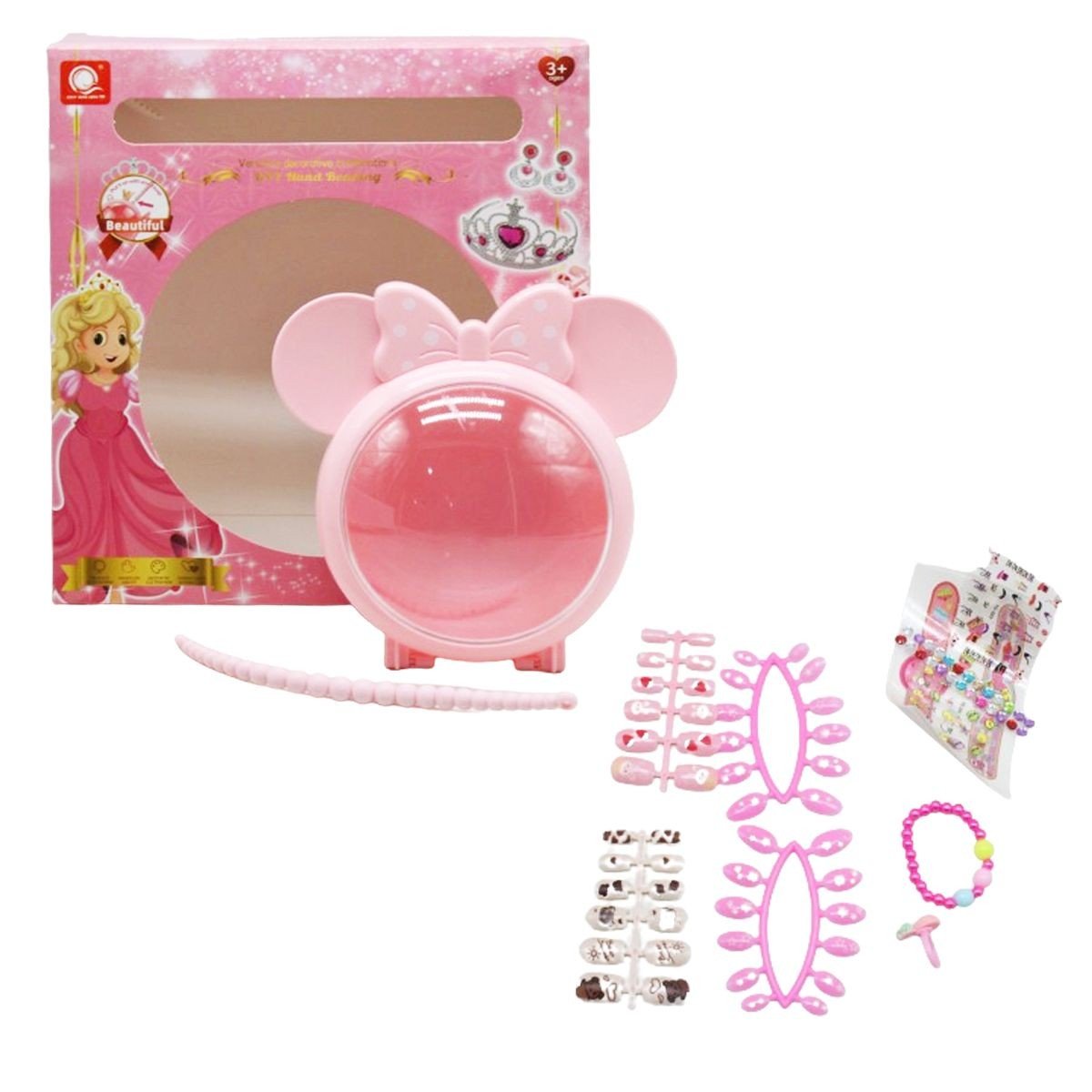 Великий набір прикрас буде чудовим подарунком маленьким модницям. У комплекті є 4 набори пластикових накладних нігтів та клейка база для них, наклейки на нігті, стрази, пилка, роздільник пальців для педикюру. Також у наборі є 2 аркуші з тимчасовими татуюваннями у вигляді наручного годинника, а також біжутерія: браслетик та пластикова каблучка. Усі складові набору можна скласти в гарну пластикову коробочку у вигляді мишки Мінні Маус. Її також можна перетворити на сумочку, прикріпивши ручку. Розмір коробочки: 17х17х7 см.