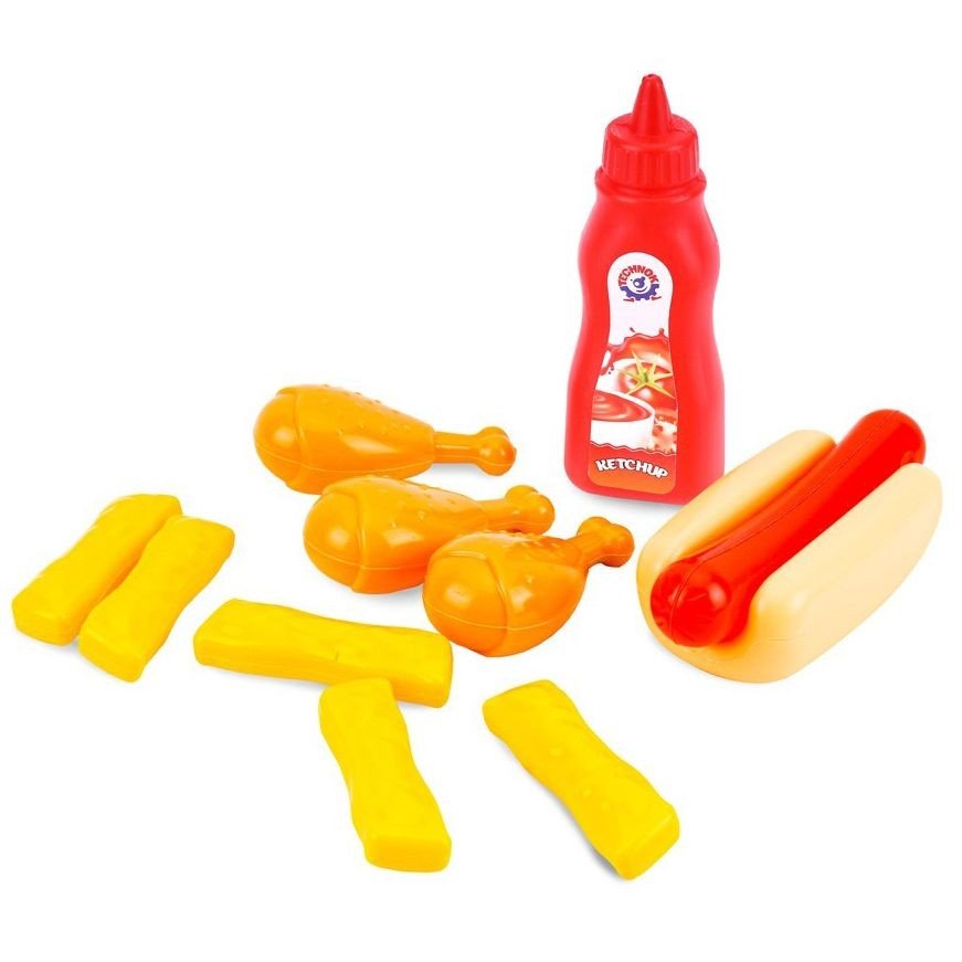 Набір пластикових продуктів у реалістичному дизайні. У комплекті є: 3 курячі гомілки, 5 шматочків картоплі фрі, пляшечка "Кетчуп", хотдог (булочка та сосиска). Різні сюжетно-рольові ігри розвивають у дітей уяву та фантазію, мислення, дрібну моторику, комунікативні та соціальні навички