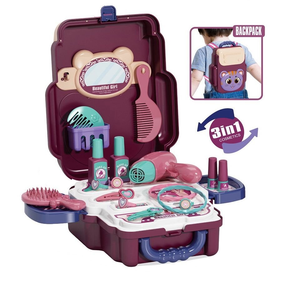Ігровий набір, який обов'язково зацікавить маленького перукаря. У наборі є ігрове перукарське приладдя (24 елементи) такі, як: фен, гребінець, гребінець, браслети та кільця, шпильки, лаки для нігтів. За допомогою спеціальних елементів, які є в наборі, рюкзак можна перетворити на справжнє трюмо. У наборі є тканинні шлейки для рюкзака. Набір призначений для дітей віком від 3-х років.