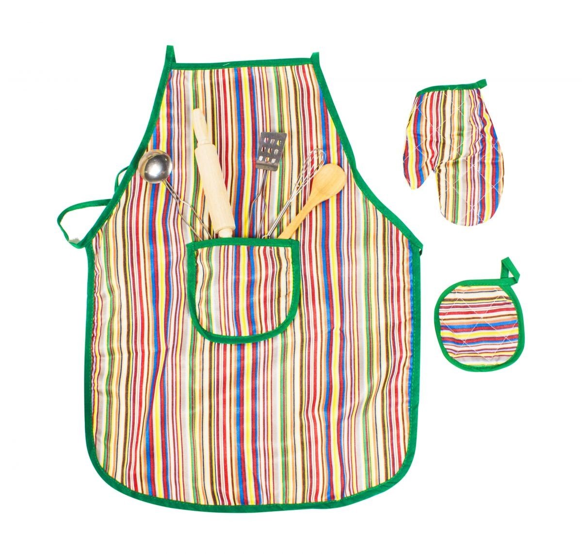 Набір "Шеф-кухар". Дуже якісний набір для юного шеф-кухаря включає в себе: тканинний фартух, 2 прихватки, деревʼяну качалку і ложку, металевий віночок, лопатку і ополоник.