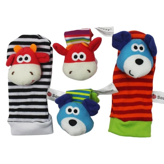 Нбор милих шкарпеток і браслетиків брязкальця. На носочках і браслетиках прикріплена плюшева брязкальце-звірятко. Набір яскравий, виготовлений з якісних та безпечних матеріалів. Підходять для дітей із перших місяців життя.