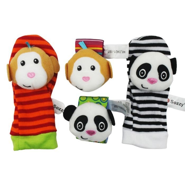 Набір милих шкарпеток і браслетиків-брязкалець. На носочках і браслетиках прикріплене плюшеве брязкальце-звірятко. Набір яскравий, виготовлений з якісних та безпечних матеріалів. Підходять для дітей із перших місяців життя.