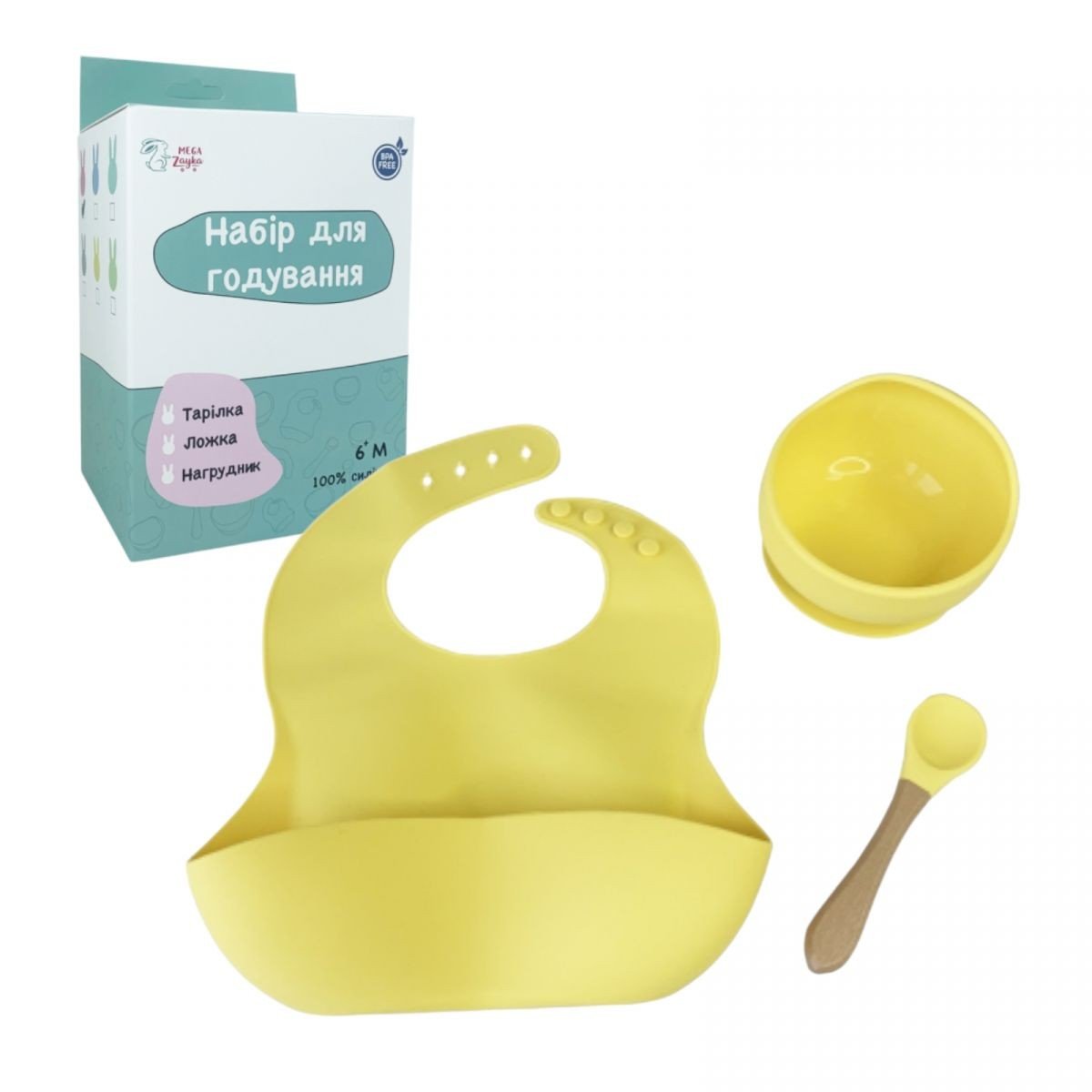 Опис Набір силіконова тарілка та слинявчик у коробці (ЖОВТИЙ)