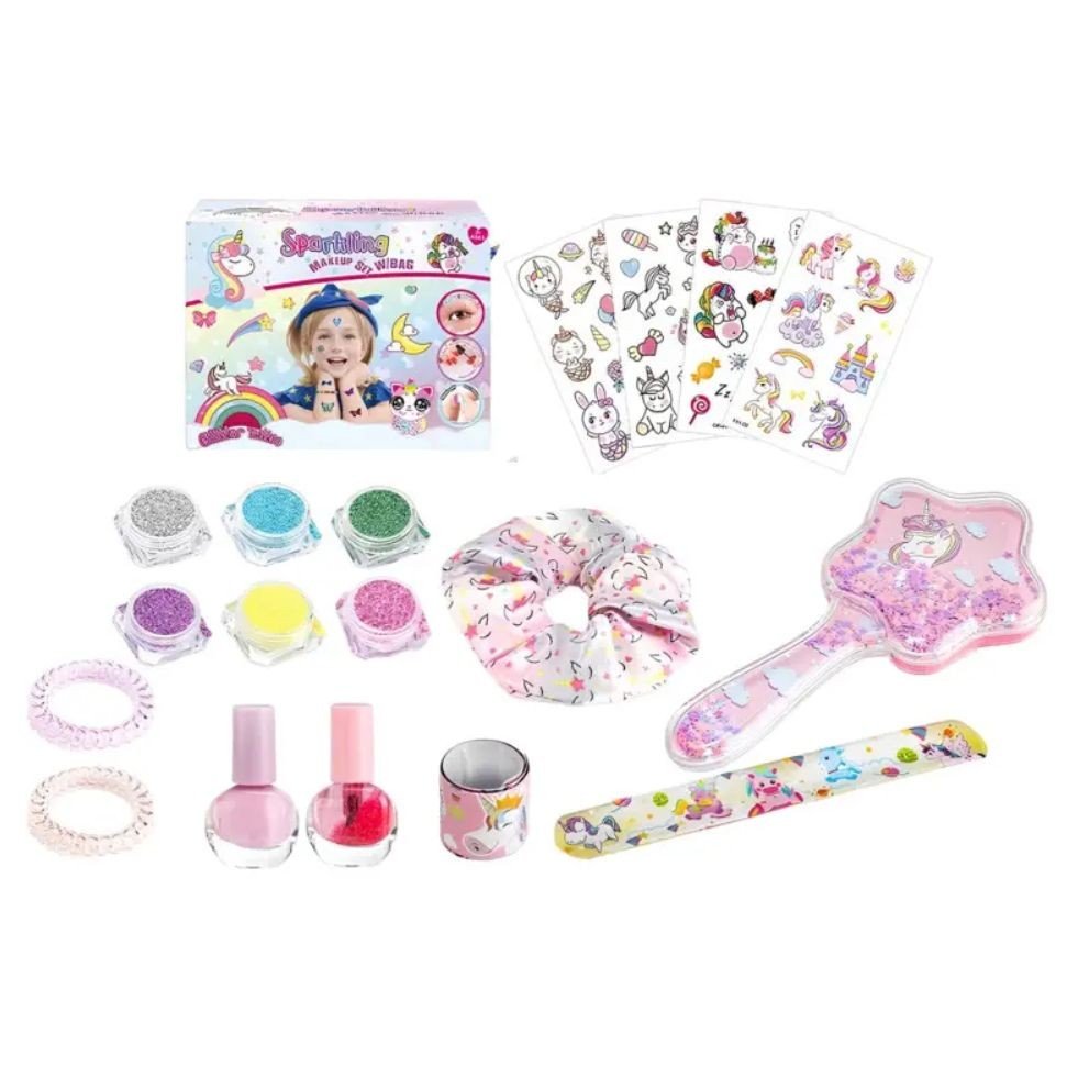Бренд: MIC Упаковка: Коробка Колір: Різнобарв'я Вага з упаковкою: 353 г Габарити в упаковці: 16.5 x 22 x 9 см Країна виробник: Китай Матеріал: Комбінований Комплектація: резинки для волосся (3 шт.), тату-перебивки, набір сипучих різнокольорових блискіток (6 кольорів), лак для нігтів (2 кольори), слеп-браслети (2 шт.) та гребінець.
