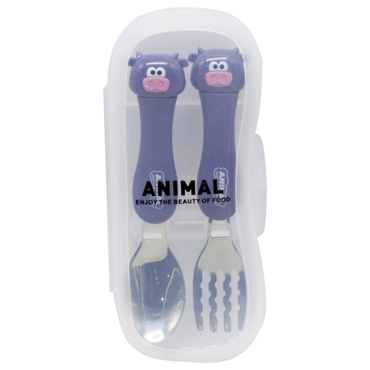 Набір дитячих столових приборів. Металеві. Ручки досить великі та виконані у формі кумедних персонажів. Довжина 1 прибору - 14,5 см. Упаковано все в пластиковий футляр.