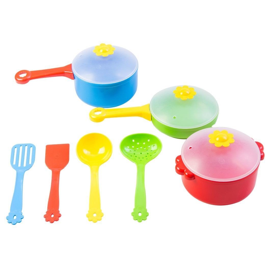Яскравий набір пластикового посуду. Вона складається з: сковорідок з кришечками 2 видів, каструлі з кришечкою, двох лопаток, шумівки і ополоника. Ручка з пательні знімається, перетворюючи її в зручне блюдо для випічки. Діаметр каструльки: 12 см.