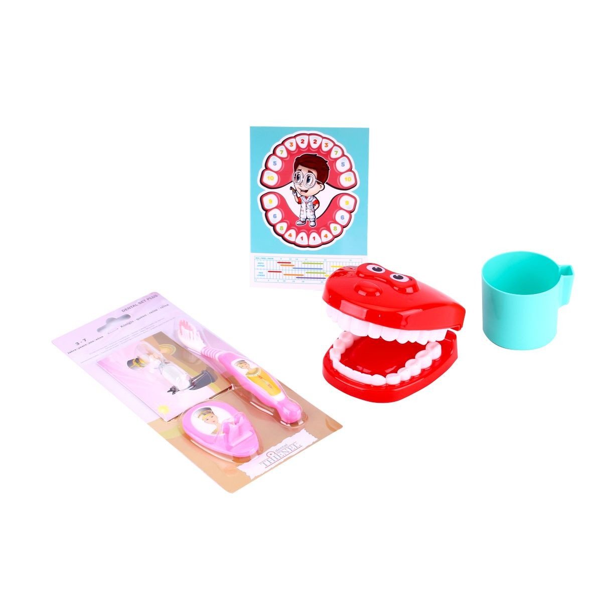 Набір юного стоматолога перетворить чищення зубів на захоплюючу гру. У комплект входить: щелепи із зубками, пісочний годинник, стаканчик, гачок для рушника на стіну та справжню зубну щітку. Набір виконаний із якісних та безпечних матеріалів.