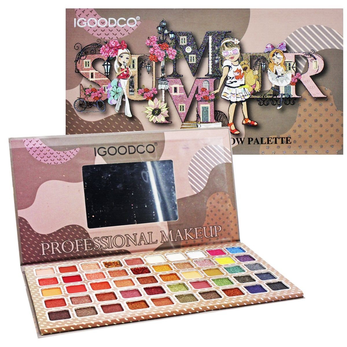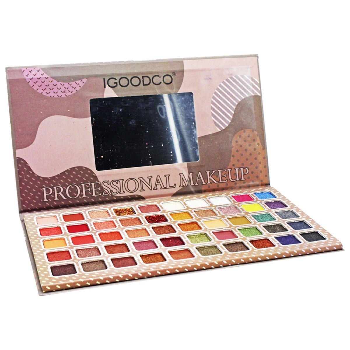 Гарний набір тіней на 50 кольорів. Такий подарунок не залишить байдужою жодну модницю. Палетка розкладна: на одній стороні знаходиться палітра, а на іншій – невеличке дзеркало. На палітрі розміщені тіні теплих та холодних відтінків. Є матові, шиммерні та сатинові текстури. Запаковано в яскраву картонну коробочку.