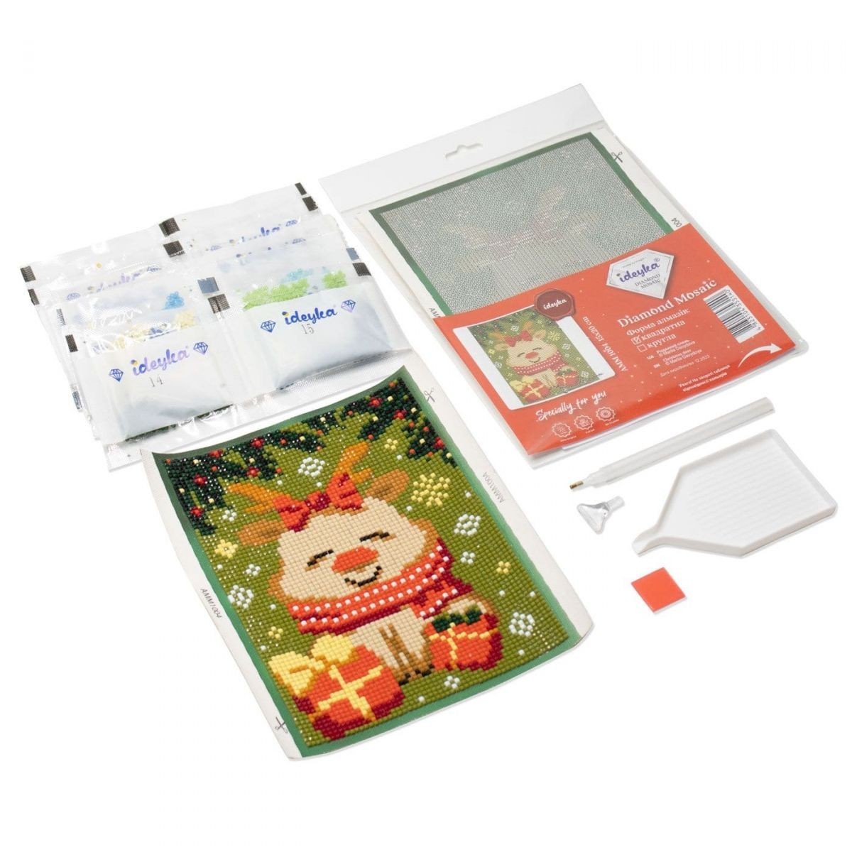 Бренд: Ідейка Упаковка: Пакет Колір: Різнобарв'я Вага з упаковкою: 71 г Габарити в упаковці: 19.5 x 12 x 2.5 см Країна виробник: Україна Матеріал: Комбінований Комплектація: магнітна основа з клейовим шаром і кольоровою схемою (2 шт), акрилові стрази згідно комплектації набору (круглі), спеціальна ручка-стилус для роботи зі стразами, гель-клей, лоток для сортування стразів, таблиця відповідності кольорів та символів (дивіться на звороті етикетки).