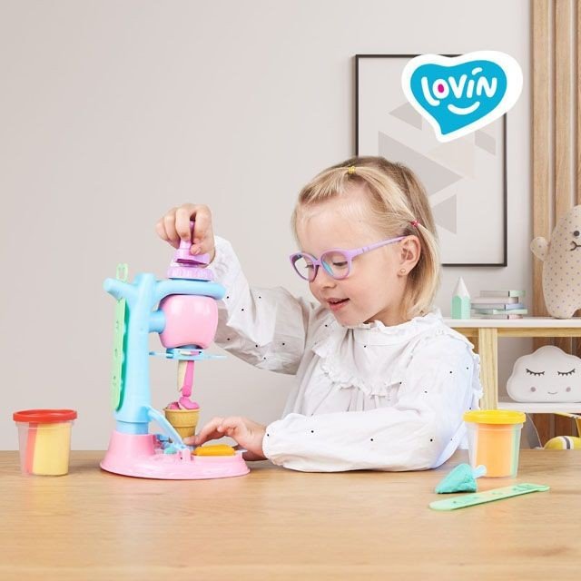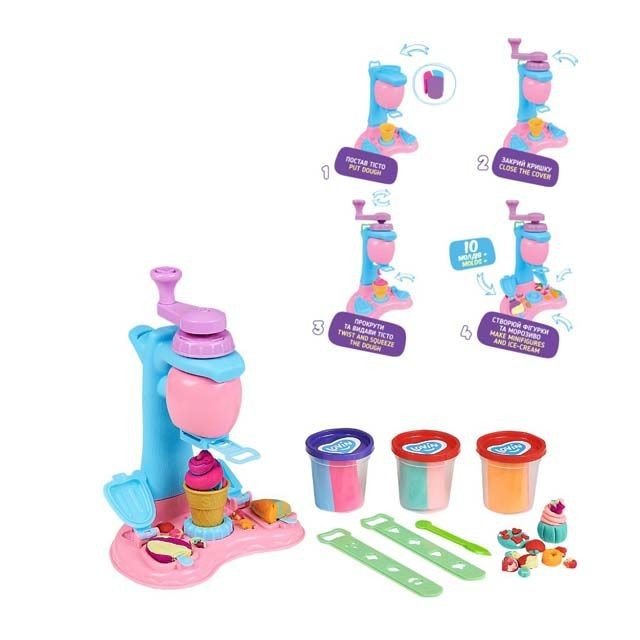 Набір для ліплення з повітряним тістом "Ice Сream Сafe". У наборі є 3 стаканчики з тістом (по 3 кольори тесту в кожному стаканчику), а головною фішкою набору є пластикова машина для виготовлення морозива та 8 насадок для неї, за допомогою яких дитина зможе створити понад 100 можливих комбінацій форм та кольорів та десерту. На основі машинки є 10 молдів, за допомогою яких можна створити оригінальні прикраси для морозива. Для дітей віком від 3-х років.