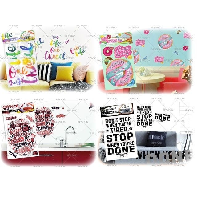 Набір декоративних наліпок на аркуші А3. Такі наліпки можна використовувати для дизайну стін, дверей, вікон або меблів. Поради з використання: 1.Визначте місце, яке хочете задекорувати; 2.Витріть насухо поверхню; 3.Дістаньте аркуш з пакету; 4. Відклейте зображення від підкладки та наклейте на підготовлену поверхню; 5.Складіть композицію з елементів у наборі відповідно до зразка на пакуванні або на власний розсуд.