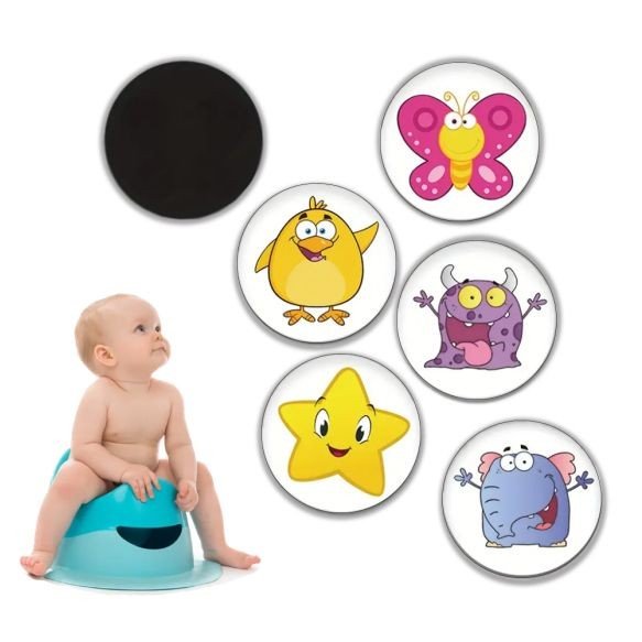 Наліпки для привчання дитини до горщика допоможуть швидко та легко здобути здобути нову навичку. Як це працює: зображення тваринки проявляється, коли на наклейку потрапляє тепла рідина. Після висихання наліпка знову темніє. Спосіб застосування: приклейте наліпку на суху знежирену поверхню; покажіть дитині, як при контакті з теплою водою зʼявиться яскравий персонаЖ; промийте наліпку холодною водою і малюнок зникне.Термін використання: 8+ тижнів. Розмір наліпки - 7 см. Матеріал: термовініл. У комплекті є 5 наліпок.
