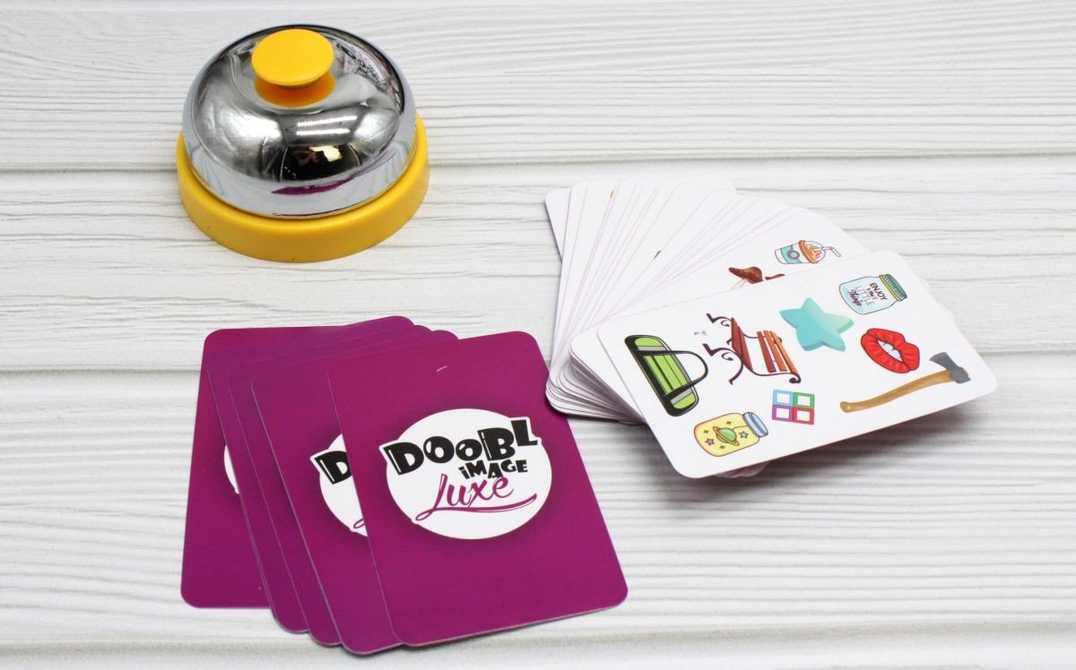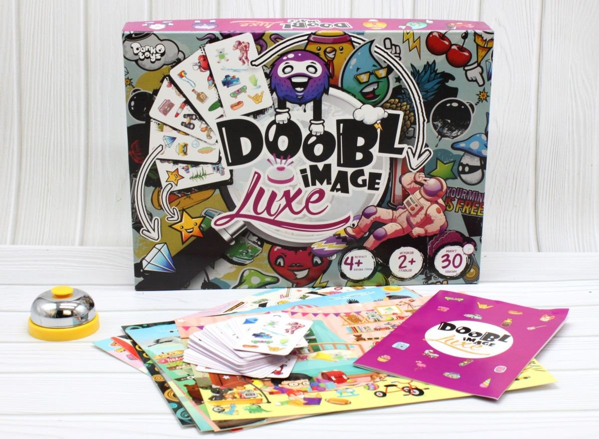 Захоплююча настільна гра на пошук збігів "Doobl Image Luxe". Потрібно знаходити збіги між картинками на картках і ігрових полях. Хто першим знаходить такий збіг - натискає на дзвінок. Є кілька варіантів гри (прописані в інструкції). Розрахована на 2+ гравців від 4-х років.