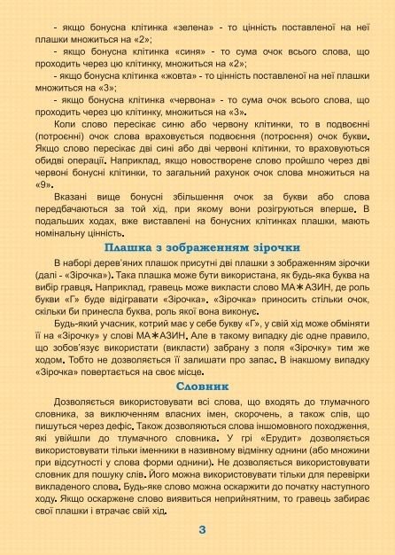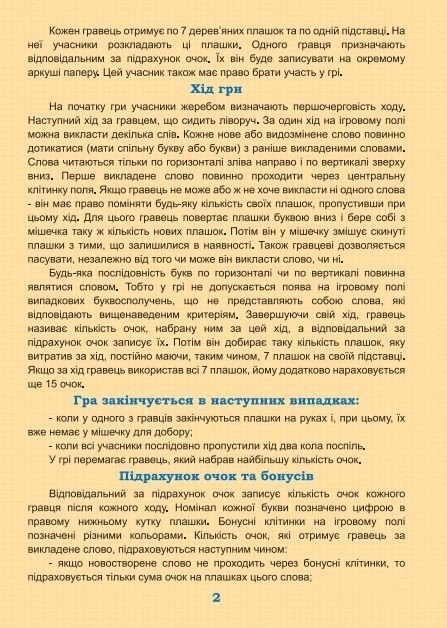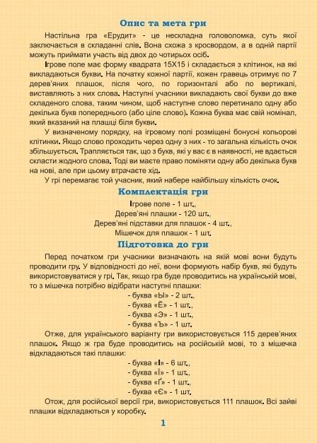Настільна гра "Ерудит". Можуть грати від 2-х до 4-х чоловік. лову формуються або по вертикалі, або по горизонталі зверху вниз або зліва на право. Слова повинні бути присутніми в стандартному словнику і гравці виходять окуляри формуючи слова на дошці. Сенс гри полягає в тому, щоб набрати якомога більше очок. Кожна буква дає певну кількість очок і стратегія гри полягає в тому, що б скласти слово з найбільшою кількістю очок. Плашки з буквами - деревʼяні. У гофрокарткоробке. БУКВИ УКРАЇНСЬКОГО АЛФАВІТУ.