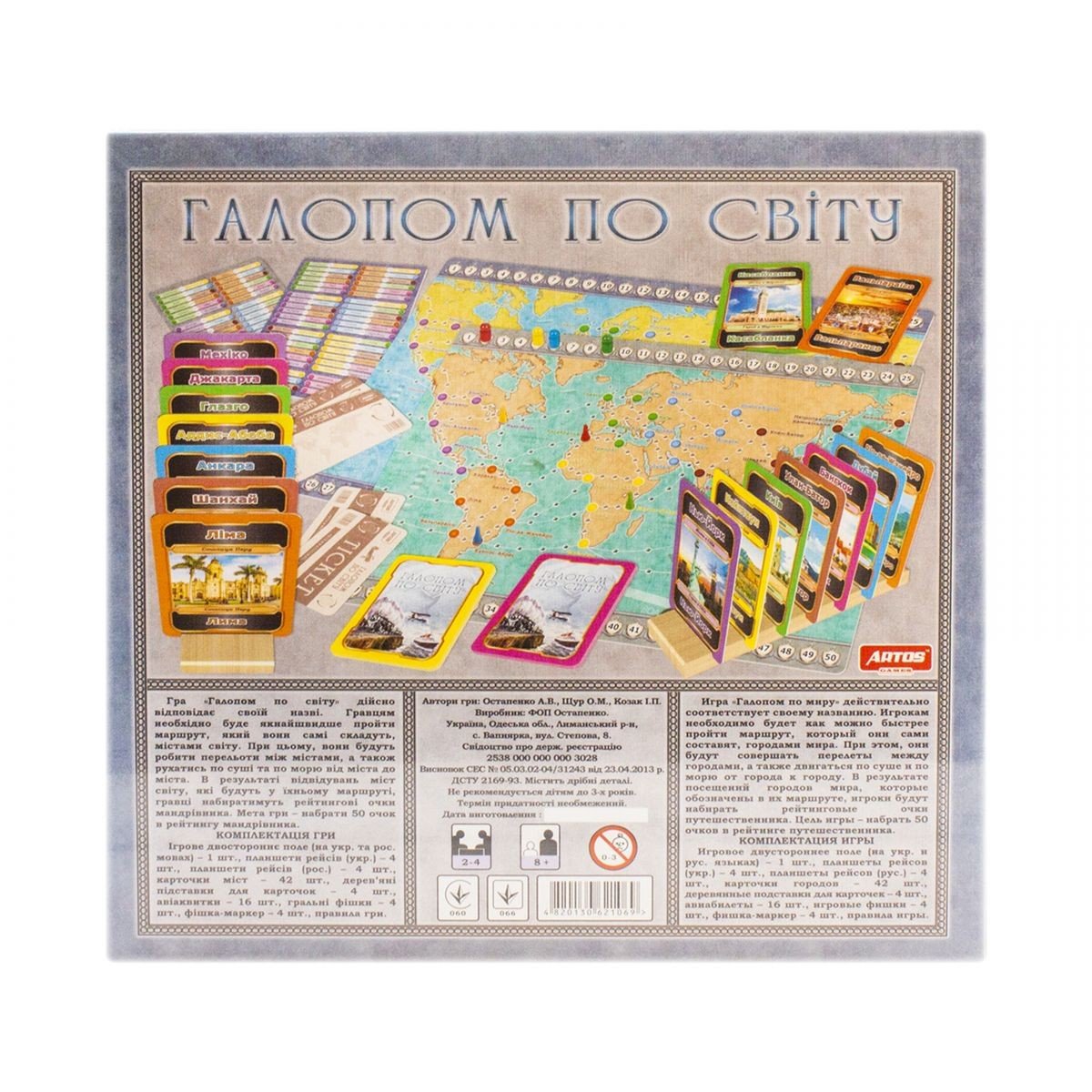 Настільна гра "Галопом по світу". Гравцям необхідно буде якомога швидше пройти маршрут, який вони самі складуть, містами світу. В результаті відвідувань міст світу, які позначені в їхньому маршруті, гравці будуть набирати рейтингові очки мандрівника. Мета гри - набрати 50 очок рейтингу мандрівника. Ігрове поле на 2-х мовах (українська).