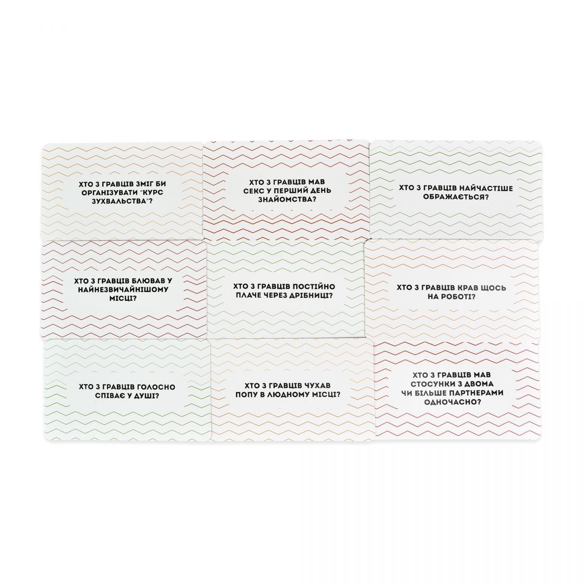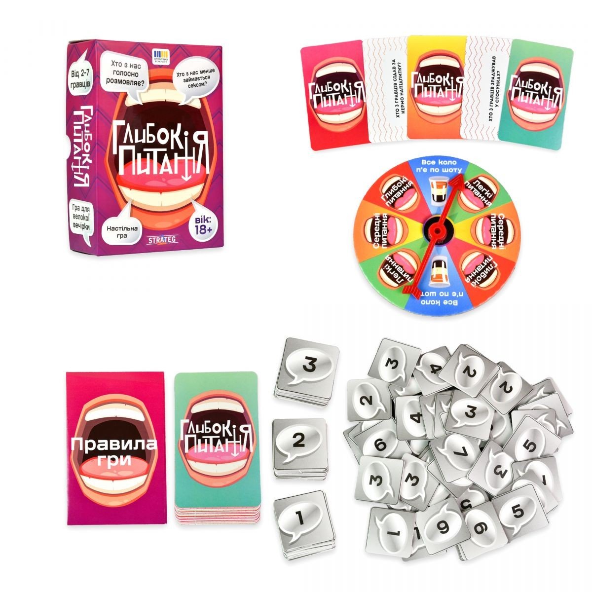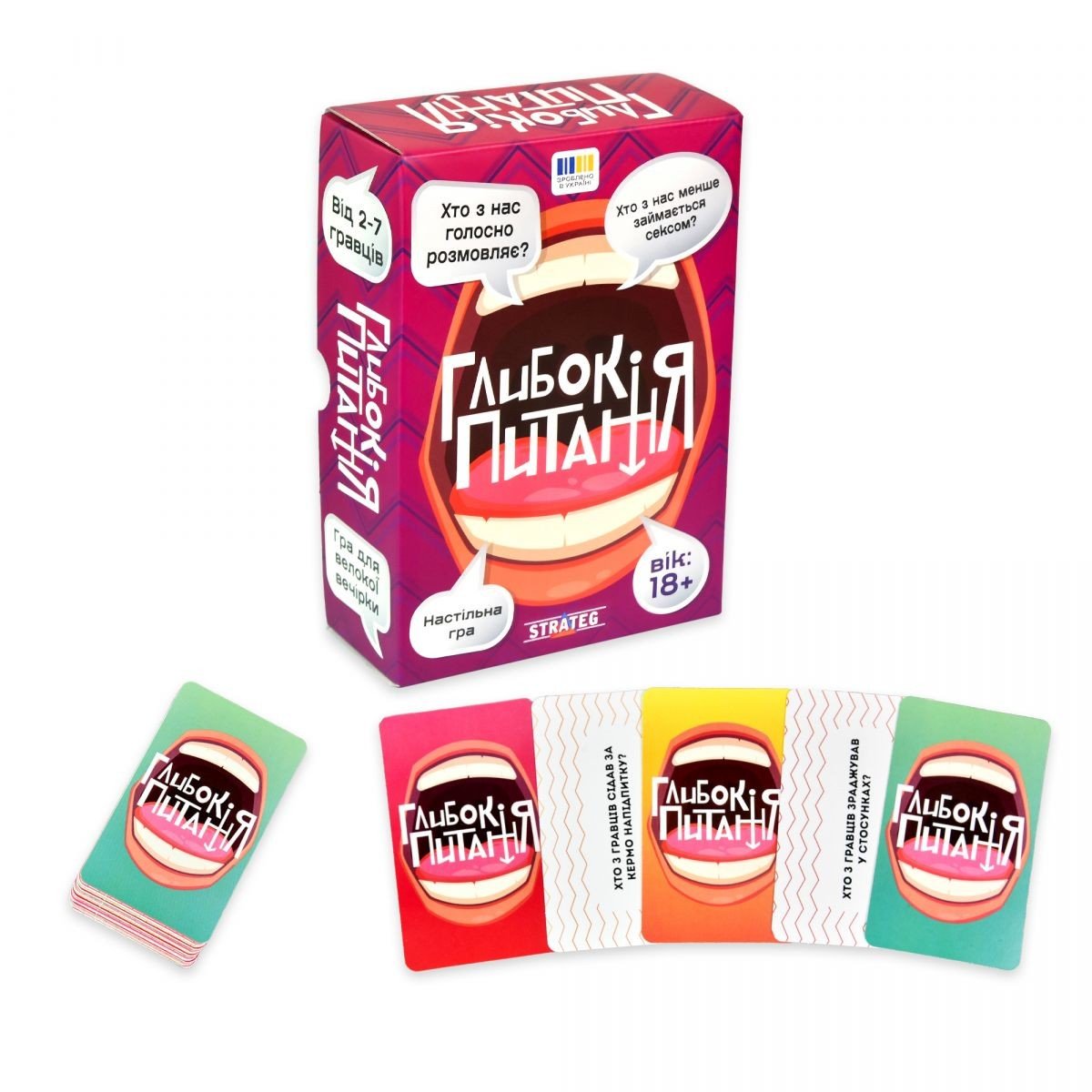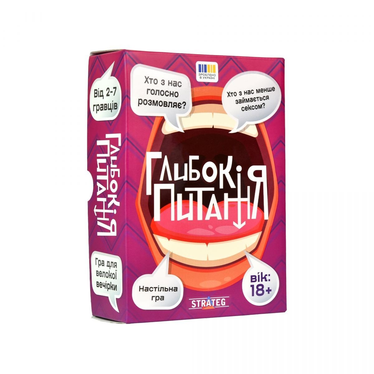 Настільна гра для компанії, яка допоможе зробити спілкування більш відкритим та цікавим. У комплекті зібрані картки із запитаннями, що провокують обговорення, викликають сміх і відкривають несподівані факти про друзів. Гра ідеально підходить для тих, хто хоче урізноманітнити вечір та дізнатися більше про людей поруч. Як грати: Витягніть карту із запитанням. Визначте, кому з компанії воно найбільше підходить. Обговорюйте відповіді, відкриваючи нові сторони знайомих."Глибокі питання" стануть чудовим доповненням до вечірок, дружніх зустрічей або невимушених посиденьок, допомагаючи краще пізнати один одного та створити яскраві спогади.