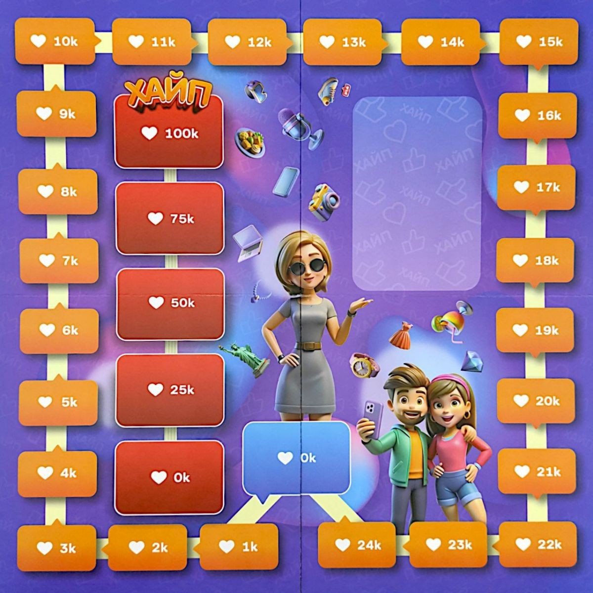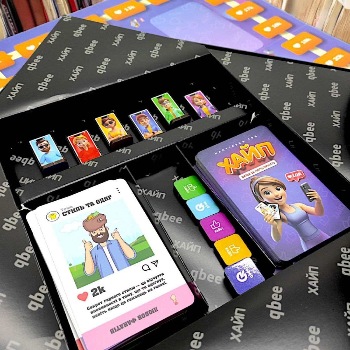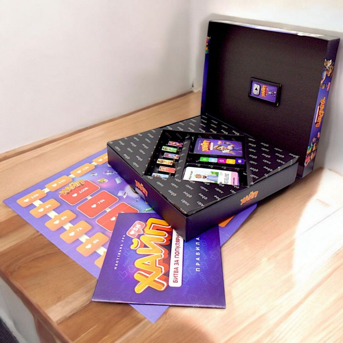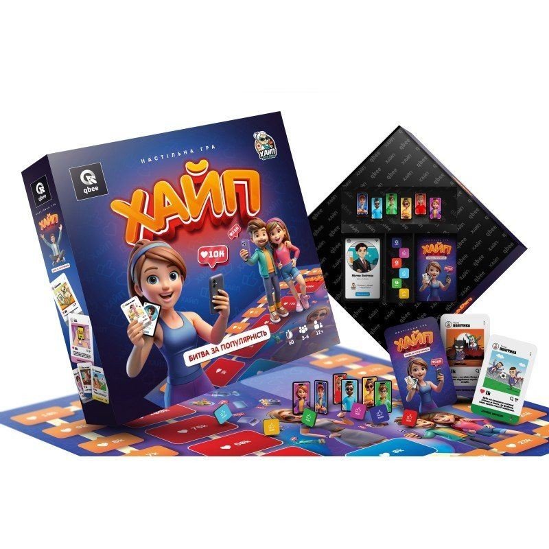 У даній грі Ви перетворюєтеся на блогерів, які змагаються за увагу аудиторії. Умовою перемоги є отримання найбільшої кількості вподобань у битві за популярність. Підбирайте якомога ефективніші пости до своєї стрічки, просувайте найбільш вдалі з них, блокуйте пости суперників, робіть вдалі загальні подкасти та не втрачайте можливості зловити "Хайп" на актуальній темі. До комплекту входить: гральні картки - 173 шт., гральні фігурки - 12 шт., ігрове поле - 1 шт., інструкція - 1 шт. Час гри - приблизно 60 хв. Гра розрахована на 3-6 гравців старше 12 років.