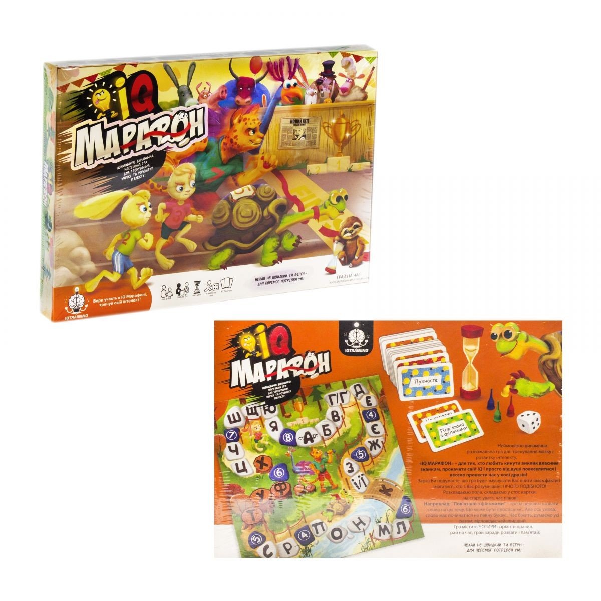 Настільна гра "IQ-Марафон". Розкладаємо ігрове поле, складаємо картки і можна починати гру. Приклад: на картці написано "Пов'язано з фільмами" - треба першим назвати слово на цю тему. Але є умова: слово має починатися на певну букву. Час йде, все думають, відповідає найшвидший.