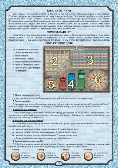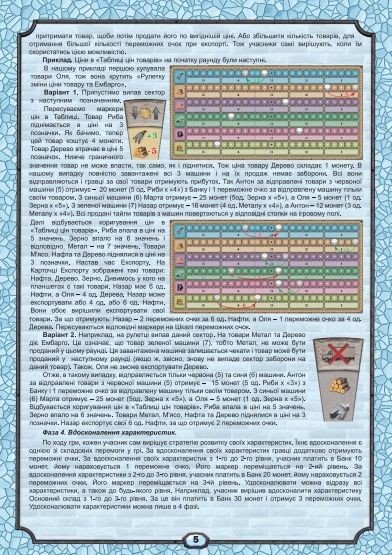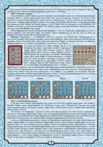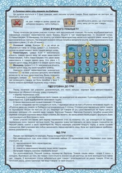 Бренд: Artos games Упаковка: Коробка Колір: Різнобарв'я Вага з упаковкою: 1300 г Габарити в упаковці: 33 x 8 x 32 см Габарити без упаковки: 33 x 8 x 32 см Країна виробник: Україна Матеріал: Комбінований Комплектація: Ігрове поле 4 шт. ігрових планшета 30 карток товарів 12 карток експорту 150 фішок товарів (6 видів) 42 монети чотирьох номіналів 40 шт. маркери 4шт. маркери переможних очок 6шт. маркери цін товарів 2шт. стрілки до ігрового поля