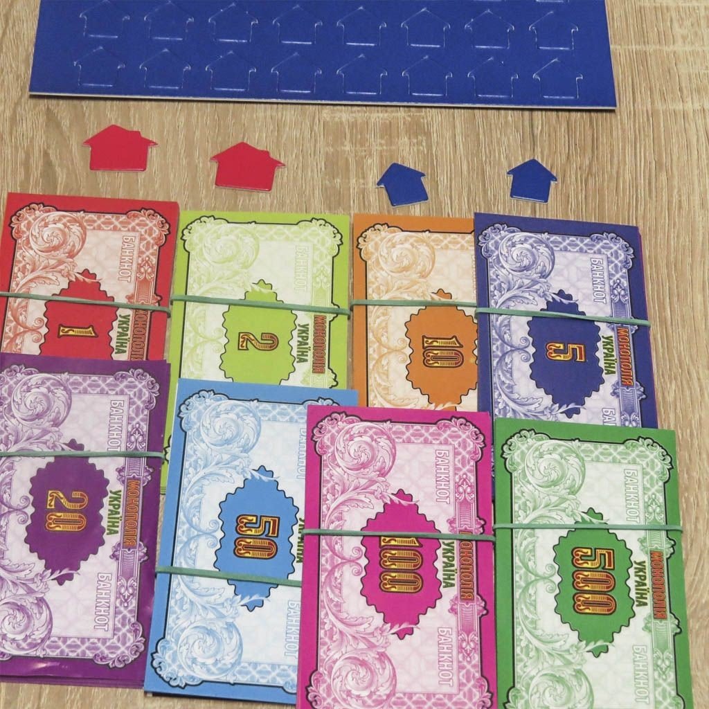 Комплектація: 1 - ігрове поле, 4 - гральних фішки, 2 - гральних кубика, 1 - комплект спеціальних грошей, 12 готелів, 32 Будинки, 28 - карток-Документів на право власності, 16 карток "Державний бюджет", 16 - "карток Шанс", докладні правила українською мовою