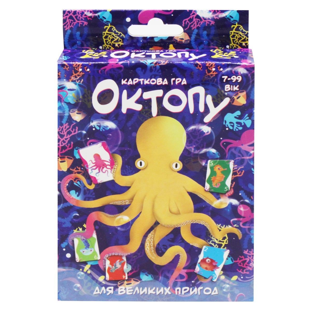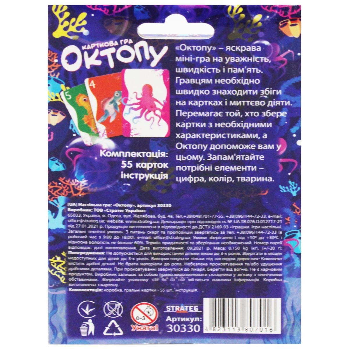 Яскрава міні-гра на уважність, швидкість та пам'ять. Гравцям необхідно швидко знаходити збіги на картках та миттєво діяти. Перемагає той, хто збере картки з необхідними характеристиками, а Октопу допоможе вам у цьому. Запам'ятайте подібні елементи – цифра, колір, тварина. Гра для дітей віком від 7-ми років, у комплекті 55 карток.