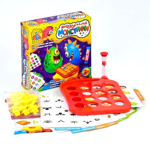 Настільна гра "Розумні монстрики". Гра починається з вибору картки для запам'ятовування. Вставте картку в основу, і починайте запам'ятовувати картинки після перекидання пісочного годинника. Після виходу часу все картинки накривають кришкою. Наймолодший гравець починає піднімати кришку і шукати 2 однакові картинки, якщо вгадав - відкривай ще одну, якщо немає - передавай естафету іншому гравцеві. Гра закінчується коли всі картинки відкриті. Перемагає той гравець, який з'єднав більше зображень.